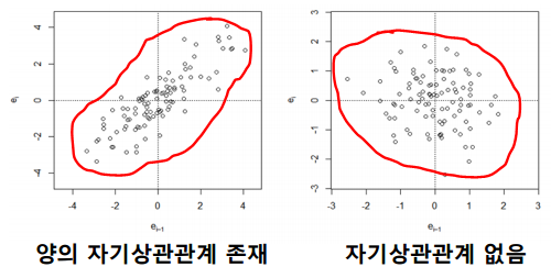 자료가 시간순으로 관측된 경우(시계열자료) $e_{t-k}, e_t$의 산점도를 확인하겠습니다.