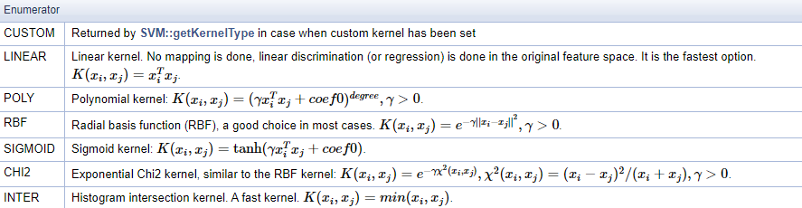 Support Vector Machines. More... #include enum KernelTypes { CUSTOM =-1, LINEAR =0, POLY =1, RBF =2, SIGMOID =3, CHI2 =4, INTER =5 } SVM kernel type More... enum ParamTypes { C =0, GAMMA =1, P =2, NU =3,