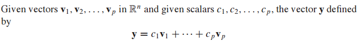 이것을 weights($c_1, ... , c_p$)가 있는 $v_1, ... ,v_p$의 선형 결합(linear combination)이라고 합니다.
