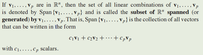 $v_1, ... ,v_p$가 있을 때 span은 $c_1v_1 + ... + c_pv_p$ 형태의 linear combination을 의미합니다.