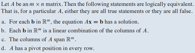$R^m$ 공간에 있는 임의의 b에 대해서 Ax=b(matrix equation)은 solution을 갖고 있다.
