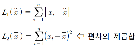 정리를 해보면 $L_1$일 때에는 표본중앙값 $\widetilde{x}$, $L_2$인 경우에는 표본평균 $\overline{x}$가 중심위치로 사용됩니다. 이를 정리하면 퍼져 있는 정도를 나타내는 통계값으로