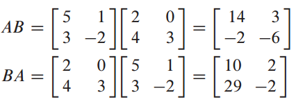 일반적인 실수 체계에서는 AB=BA가 성립하지면 matrix 체계에서는 성립하지 않습니다.