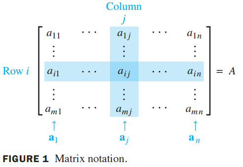 A가 mxn 행렬이면 i번째 행, j번째 열에 있는 스칼라 항목은 $a_{ij}$로 표기합니다.