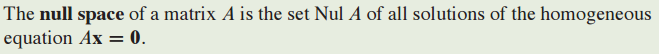 행렬 A의 영 공간(null space)은 제차 방정식(homogeneous equation) Ax=0의 모든 해의 집합을 의미합니다.