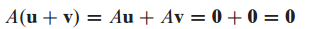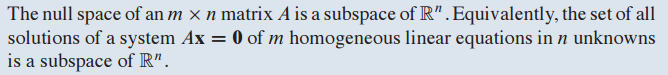 동일하게, n 개의 미지수를 갖고 있는 m개의 제차 방정식의 Ax=0의 모든 해의 집합은 $R^n$ 공간의 부분공간입니다.