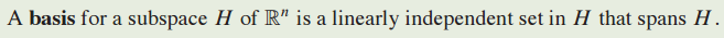 $R^n$ 공간의 부분공간 H에 대한 기저(basis)는 H를 span하는 선형 독립 집합(linearly independent set)입니다.
