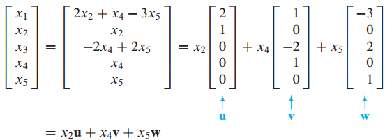 $x_2u + x_4v + x_5w$ = 0 을 풀면 $x_2, x_4, x_5$가 free variable이므로 trivial solution만 존재합니다.