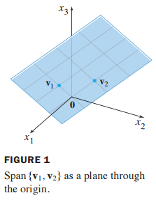위 그림처럼 Span{$v_1, v_2$}는 원점(origin)을 지나는 평면인 $R^3$ 공간의 subspace가 됩니다.