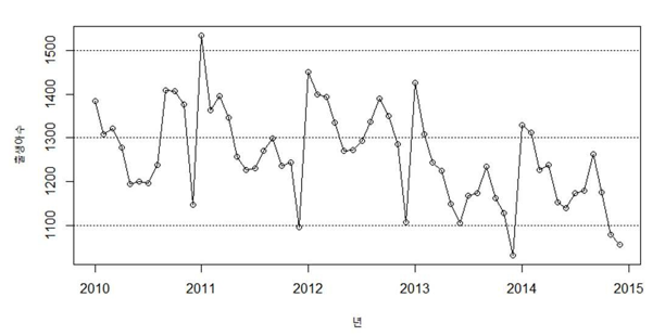 자료가 시간에 따라 관측된 경우 x 축에 관측시험, y축에 관측된 값을 표시한 산점도를 시계열 그림(time serise plot)이라고 합니다. 순서 파악을 쉽게하기 위해 일반적으로 관측 순으로 관측값들을 선으로 연결합니다.