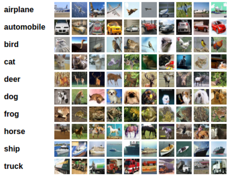 이것은 'airplane', ‘automobile’, ‘bird’, ‘cat’, ‘deer’, ‘dog’, ‘frog’, ‘horse’, ‘ship’, ‘truck’ 클래스를 갖고 있습니다.