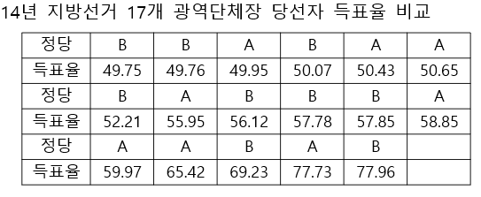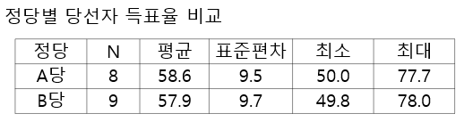 이를 정당별 당선자 득표율 비교를 위해 표를 하나 더 만들어 보겠습니다.