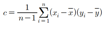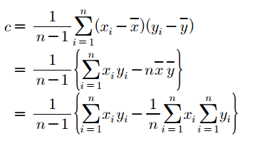 표본공분산 식에서 y를 x로 바꾸면 표본분산 식이 나옵니다. 이 의미는 두 변수 x와 y의 분산 형태를 가진다고하여 $C_{xy}$를 표본공분산이라고 합니다. 실제 계산을 할 때는 다음과 같은 간편식을 사용할 수 있습니다.