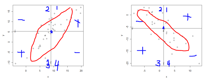 위의 산점도는 ($\overline{x}$, $\overline{y}$)를 중심으로 1과 3사분면은 양수를, 2와 4사분면은 음수를 의미하게 됩니다. 이러한 성질을 반영할 수 있는 값이 각 변수의 편차를 곱한 $(x_i - \overline{x})(y_i - \overline{y})$입니다.