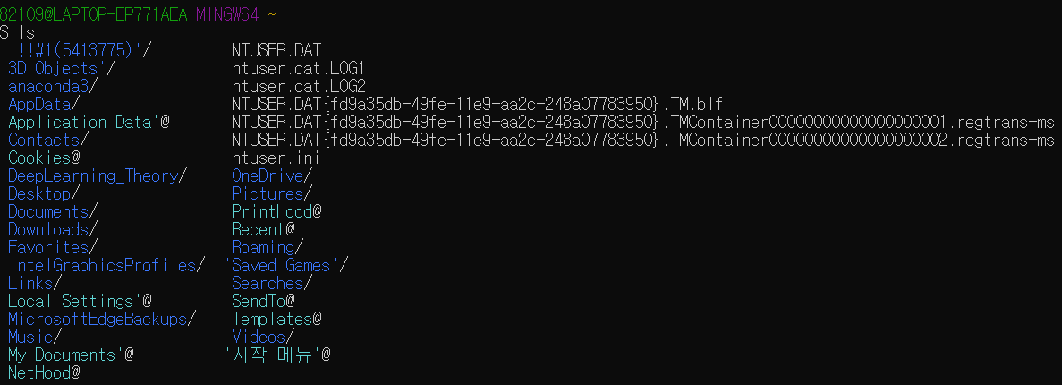 | ~ | 현재 접속 중인 사용자의 홈 디렉터리를 가리킵니다. 홈 디렉터리의 경로는 'c/Users/사용자 아이디' 입니다. 사용자 디렉터리라고도 부르며 사용자 아이디는 5글자 까지 나타냅니다. |