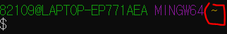 깃 배시를 실행한 후 커서 윗줄을 보면 맨 끝에 물결 표시(~)가 있습니다.