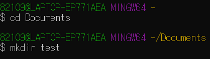Documents 디렉터리에 'test'라는 하위 디렉터리를 만들어 보겠습니다.