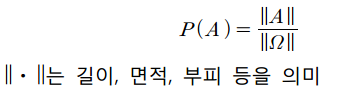 이를 원소의 수의 비율로 표시하면 확률이 $\frac\infty\infty$이 됩니다. 따라서 연속표본공간에서는 발생가능성이 동일한 상황을 선이나 평면을 이용하여 설명합니다. 표본공간 S를 선이나 평면으로 표시하고 사건 A를 이 선이나 평면의 일부분으로 표시합니다. 사건 A가 발생한다는 것은, 영역 S내에서 임의의 한 점을 무작위로 택할 때 이 점이 영역 A에 있다는 것을 의미하며 이에 대한 확률은 다음과 같이 전체 영역에서 A가 차지하는 비율로 쓸 수 있습니다. 이때 사건 A의 확률 P(A)를 다음과 같이 쓸 수 있습니다.