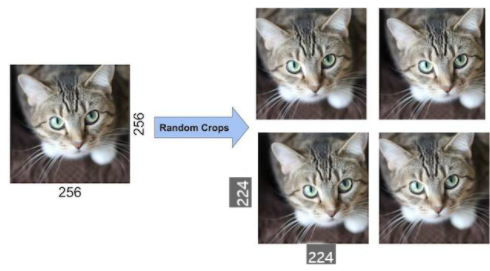 256x256 이미지에서 224x224 크기로 crop을 합니다. crop 위치는 중앙, 좌측 상단, 좌측 하단, 우측 상단, 우측 하단 이렇게 5개의 위치에서 crop을 합니다. crop으로 생성된 5개의 이미지를 horizontal reflection을 합니다. 따라서 하나의 이미지에서 10개의 이미지가 생성됩니다.