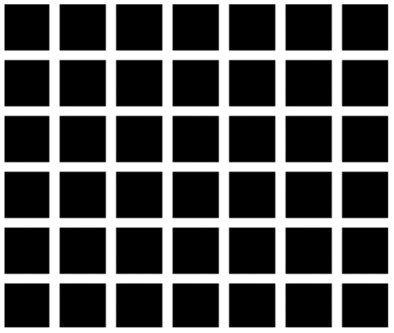 위 그림은 측면 억제의 유명한 그림인 헤르만 격자입니다. 검은 사각형안에 흰색의 선이 지나가고 있습니다. 신기한 것은 흰색의 선에 집중하지 않을 때 회식의 점이 보이는데 이러한 현상이 측면 억제에 의해 발생하는 것입니다. 이는 흰색으로 둘러싸인 측면에서 억제를 발생시키기 때문에 흰색이 더 반감되어 보입니다.