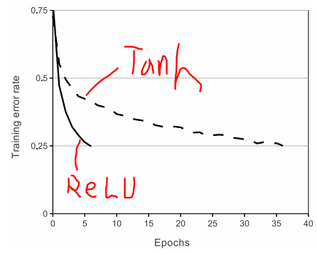 논문에서는 saturating nonlinearity(tanh, sigmoid)보다 non-saturatung nonlinearity(ReLU)의 학습 속도가 몇배는 빠르다고 나와있습니다.
