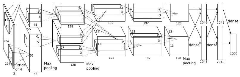 AlexNet은 일부가 max-pooling layer가 적용된 5개의 convolutional layer와 3개의 fully-connected layer로 이루어져있습니다. 아래 그림을 확인하면서 구조에 대해 세부적으로 알아보겠습니다.