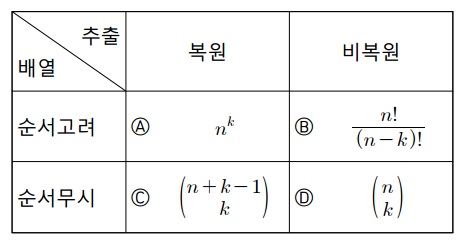 추출방법과 배열 순서에 따른 경우의 수는 다음 표와 같이 네 가지 상황으로 정리되며 이에 대한 계산 방법을 하나씩 알아보겠습니다.