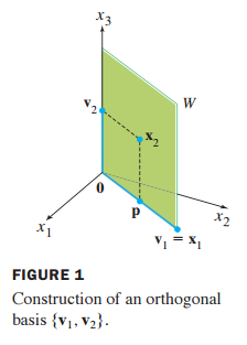 $v_2$는 $x_1$에 직교한 $x_2$의 요소이므로 {$v_1, v_2$}는 W에 대한 직교 기저라고 할 수 있습니다.