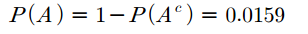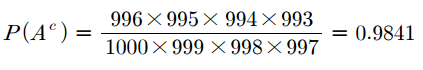 문제를 풀어보겠습니다. 즉석복권을 1000장 발행했는데 이 중 4장이 당첨복권입니다. 어떤 사람이 4장의 복권을 구입할 때 적어도 한 장 이상의 당첨복권을 구입하게 될 확률을 구해보겠습니다. 이 때 첫 번째 성질을 이용하면 쉽게 구할 수 있습니다. 한 장 이상의 당첨복권을 구입할 사건을 $A$라고 하면 $A^c$는 구입한 4장 모두 당첨되지 않을 사건으로 경우의 수 계산이 훨씬 간단합니다. 그러므로 1에서 $A^c$의 확률을 뺸 값으로 $A$의 확률을 계산하는 것이 더 효율적입니다.