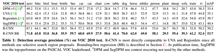 R-CNN은 이전까지 최고의 성능을 나타낸 기법의 mAP보다 30% 높은 53.3%를 달성하여 detection 분야에 새로운 방향을 제시하게 됩니다. (object detection의 성능 평가 지표는 mAP(mean average precision)입니다.)
