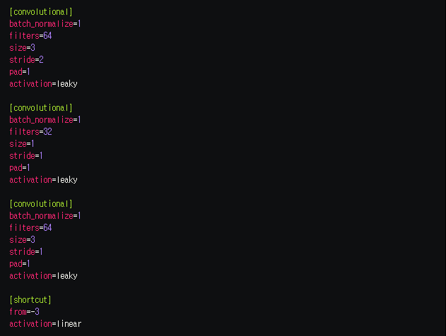 4개의 blcok를 확인할 수 있습니다. 3개의 convolutional layers 다음에 chortcut layer가 있습니다. shortcut layer는 ResNet에서 사용되는 skip connection입니다. YOLO에 사용되는 5개의 layers가 있습니다.