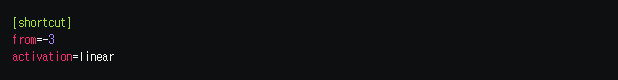 shortcut layer는 ResNet에서 사용하는 것과 유사한 skip connection입니다. from 변수가 -3은 shortcut layer의 출력이 이전 layer에서의 feature maps와 shortcut later의 3번째 뒤에 있는 layer를 추가하여 얻어지는 것을 의미합니다.