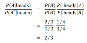P(A l heads) = (P(A) * P(heads l A)) / (P(B) * P(heads l B) + P(A) * P(heads l A))