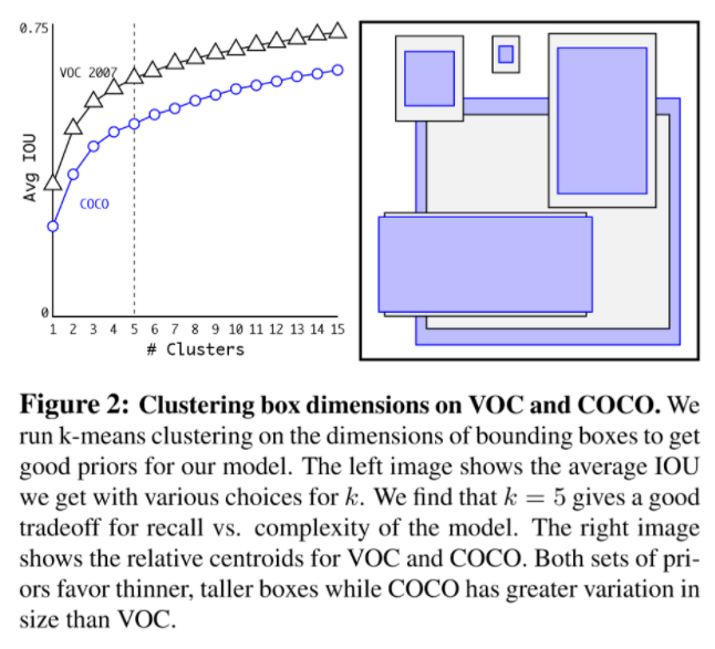 신경망은 Anchor box를 수정하면서 바운딩 박스를 예측합니다. 따라서 사전에 설정된 anchor box의 영향이 클 수 밖에 없고 신중하게 anchor box를 선택해야 합니다. 이를 해결하기 위해서 Anchor box를 training set의 바운딩박스에 k-means clustering을 사용하여 얻습니다.