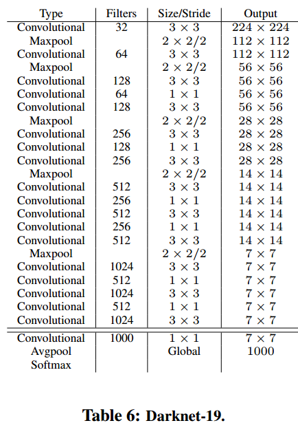 Darknet-19는 19개 convolutional layer와 5개 maxpooling layer로 구성됩니다.