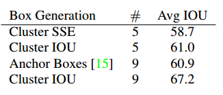 아래 표는 hand-picked anchor box와 clustering 방법을 비교한 표입니다. clustering 방법이 더 좋은 결과를 가져온다는 것을 확인할 수 있습니다.