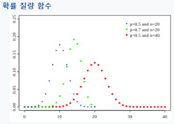 그림을 보면 모수인 p와 n에 따라 분포의 모양이 다르다는 것을 확인할 수 있습니다.