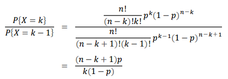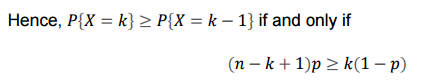 P{X=k}는 처음에는 단조 증가하고 k가 (n+1)p 이상의 값을 갖게 되면 단조 감소합니다.