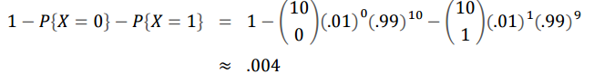 제품이 불량일 확률 0.01, 정상일 확률은 0.99입니다. 하나의 박스에 10개의 제품이 포함되어 있습니다. 박스에 2개 이상 불량품이 발견되면 환불을 해줍니다. 회사가 환불을 해야하는 확률은 어떻게 될까요?