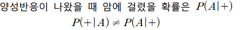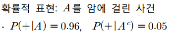 암 간이진단 검사를 실시하는데 이 검사는 암에 걸렸을 때 양성반응이 나올 확률은 0.96이고 암에 걸리지 않았을 때 양성반응이 나올 확률이 0.05라고 하겠습니다. 그리고 암에 걸릴 확률을 0.001이라고 하겠습니다. 만약 검사에서 양성반응이 나왔다면, 암에 걸렸을 확률을 구해보도록 하겠습니다.