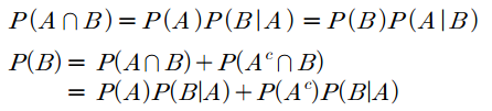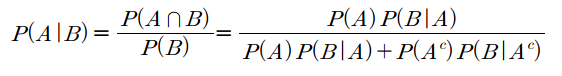 $P(B)$와 $P(A \cap B)$에 조건부확률의 응용을 적용한 식입니다. 이 식에 의하면 결과 $B$가 주어졌을 때 원인 $A$의 확률을 사전확률 $P(A)$, $P(A^c)$와 일반적인 순서의 조건부확률을 이용하여 계산할 수 있다는 것입니다. $P(A)$의 정보(사전정보)를 알고 있다면 풀 수 있습니다.