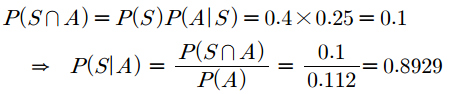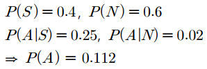 포털회사에서 스팸메일을 걸러내는 시스템을 개발하기 위해 메일 내용에 특정 단어가 들어갔을 때 스팸메일일 확률을 계산하고자 합니다. 수신메일중 40%가 스팸메일이고 나머지는 정상메일입니다. 스팸메일 중 내용에 '$A$'라는 단어가 있는 메일은 25%이고 정상메일 중 이 단어가 있는 경우는 2%라고 하겠습니다. 전체 메일 중 '$A$'단어를 포함한 메일의 비율은 이전 포스팅에서 풀었으므로 $P(A)$ = 0.112라는 정보를 이용하겠습니다.