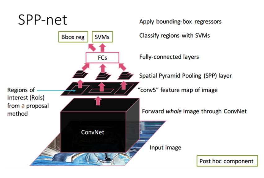 SPPnet은 CNN 구조가 고정된 입력 이미지 크기를 입력으로 취하는 데에서 발생한 문제점을 개선하기 위해 고안되었습니다.