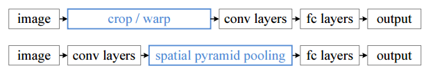 아래 그림처럼 spatial pyramid pooling layer를 추가하여 crop/warp 단계를 제거했습니다.