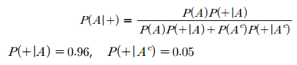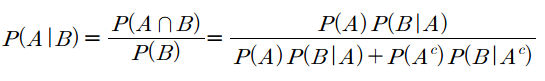 $P(B)$와 $P(A \cap B)$에 조건부확률의 응용을 적용한 식입니다. 이 식에 의하면 결과 $B$가 주어졌을 때 원인 $A$의 확률을 사전확률 $P(A)$, $P(A^c)$와 일반적인 순서의 조건부확률을 이용하여 계산할 수 있다는 것입니다. $P(A)$의 정보(사전정보)를 알고 있다면 풀 수 있습니다.