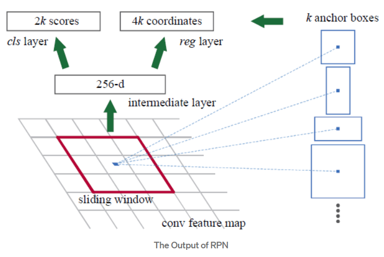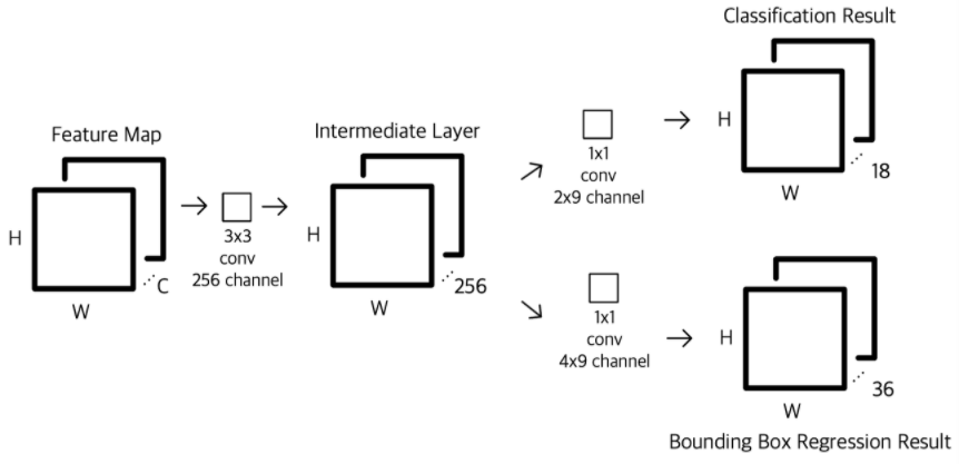 Feature map에 sliding window(3x3)을 사용하여 Intermediate Layer를 생성합니다. intermediate layer에 1x1 두 개의 conv를 적용하여 cls layer와 reg layer로 나눠집니다. cls layer는 object가 존재할 확률(1 or 0), reg layer는 bounding box의 좌표(중심 좌표, 높이 넓이)를 출력합니다. 그리고 이렇게 생성된 proposal은 RoI layer를 거쳐서 class 확률을 지니게 됩니다.