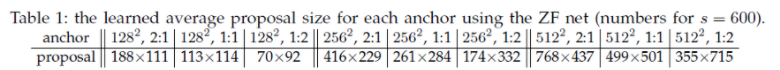 아래 표는 3개 scales(128, 256, 512), 3개 aspect ratios(1:1, 1:2, 2:1)에 대한 평균 proposal 크기 입니다.