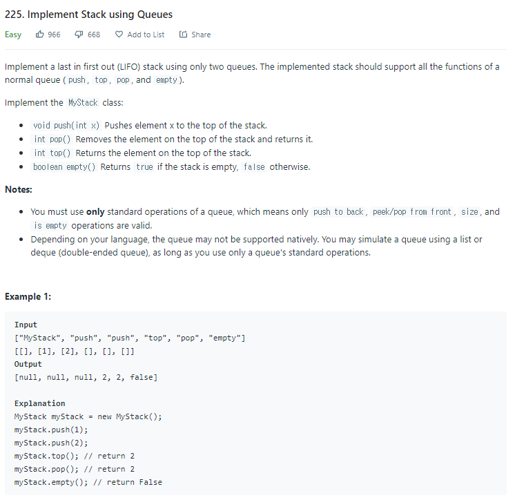 leetcode 225. Implement Stack using Queues 문제입니다.