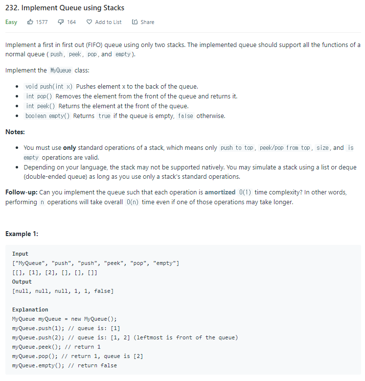 leetcode 232. Implement Queue using Stacks 문제입니다.