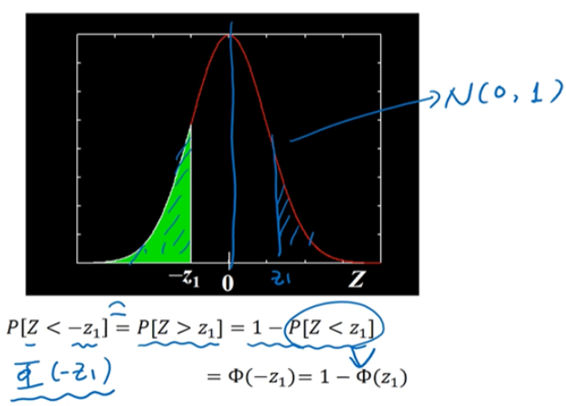 $-z_1$보다 작을 확률은 1에서 $z_1$보다 작을 확률을 빼주면 됩니다. 표준정규분포는 대칭이기 때문에 가능합니다.